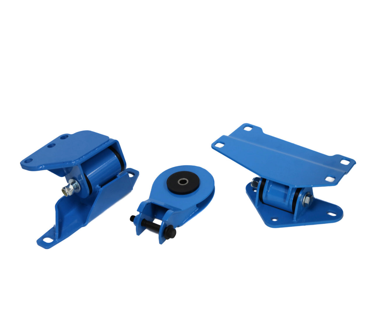 These mounts are designed to completely support the engine and transmission with durometer options to suit all styles of driving. All of our bushings can be replaced at any time. Mounts improve drive line response by inhibiting driveline lash, putting all that motion to the task of moving the car along. Say goodbye to wheel hop and hello to smoother shifts with this complete mount kit!