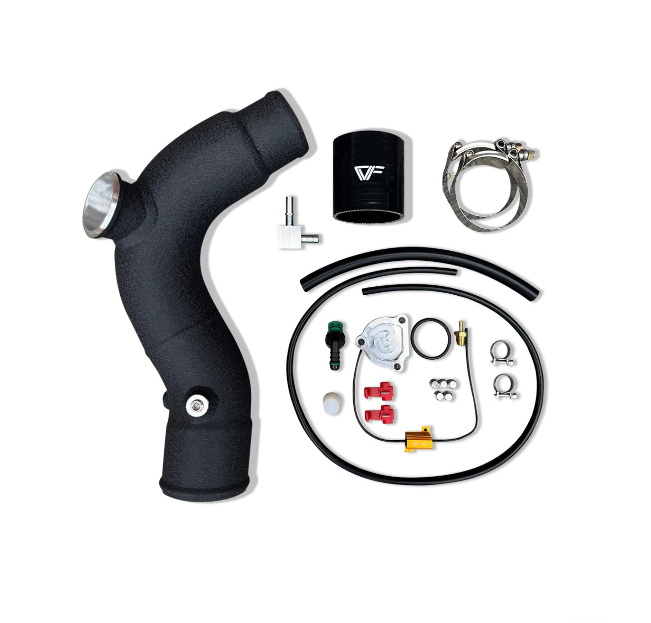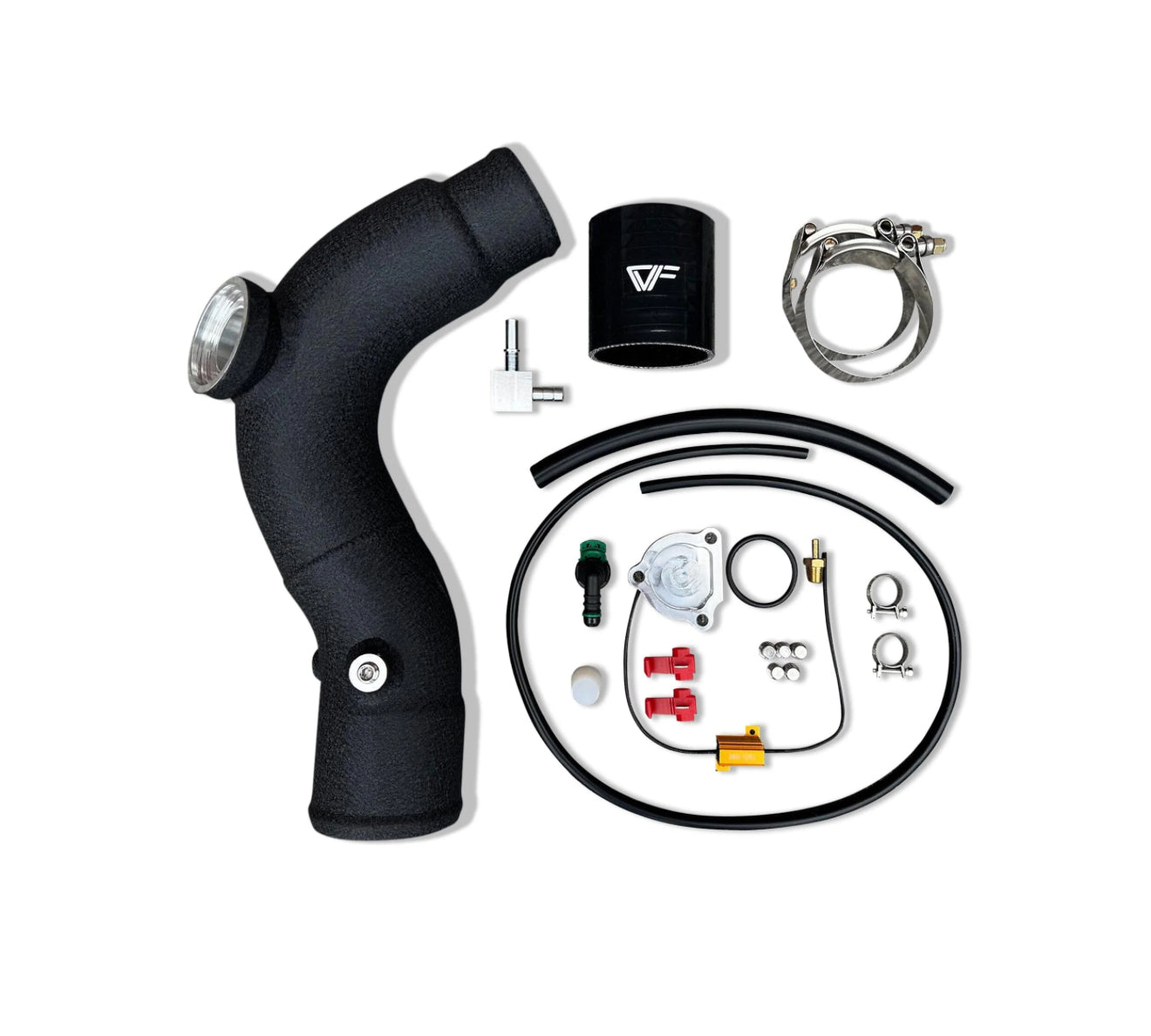 The CVF Aluminum Intercooler Hot + Cold Pipe Kit eliminates the crumpled section of the connection from the intercooler to the throttle body to maximize airflow from the intercooler (and help reduce charge air temps.). The expanded hot-side piping also flows more air into the intercooler.