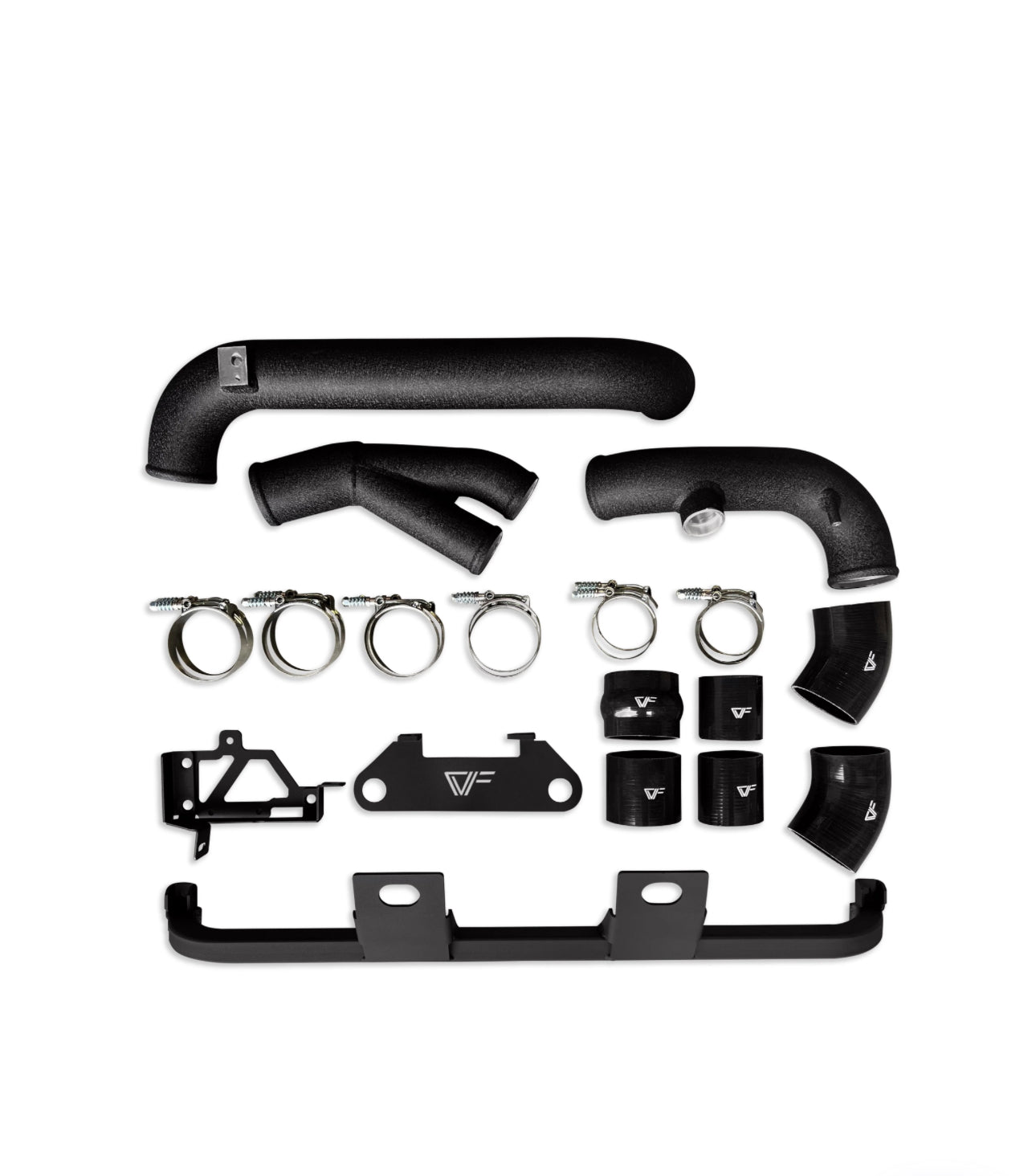 Manufactured from top-grade aluminum and accompanied by upgraded intercooler piping (also aluminum), the CVF Titan High Mount Intercooler features a TIG-welded proprietary bar-and-plate design for maximum durability and fully cast end tanks (imprinted with the CVF logo) to ensure maximum flow of air into the unit and out to your turbo - equaling more consistent airflow and more HP.