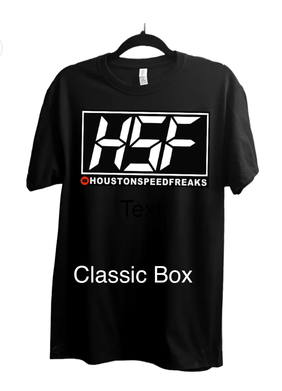 The Classic Box Tee features a large HSF logo across the front and a plain black.