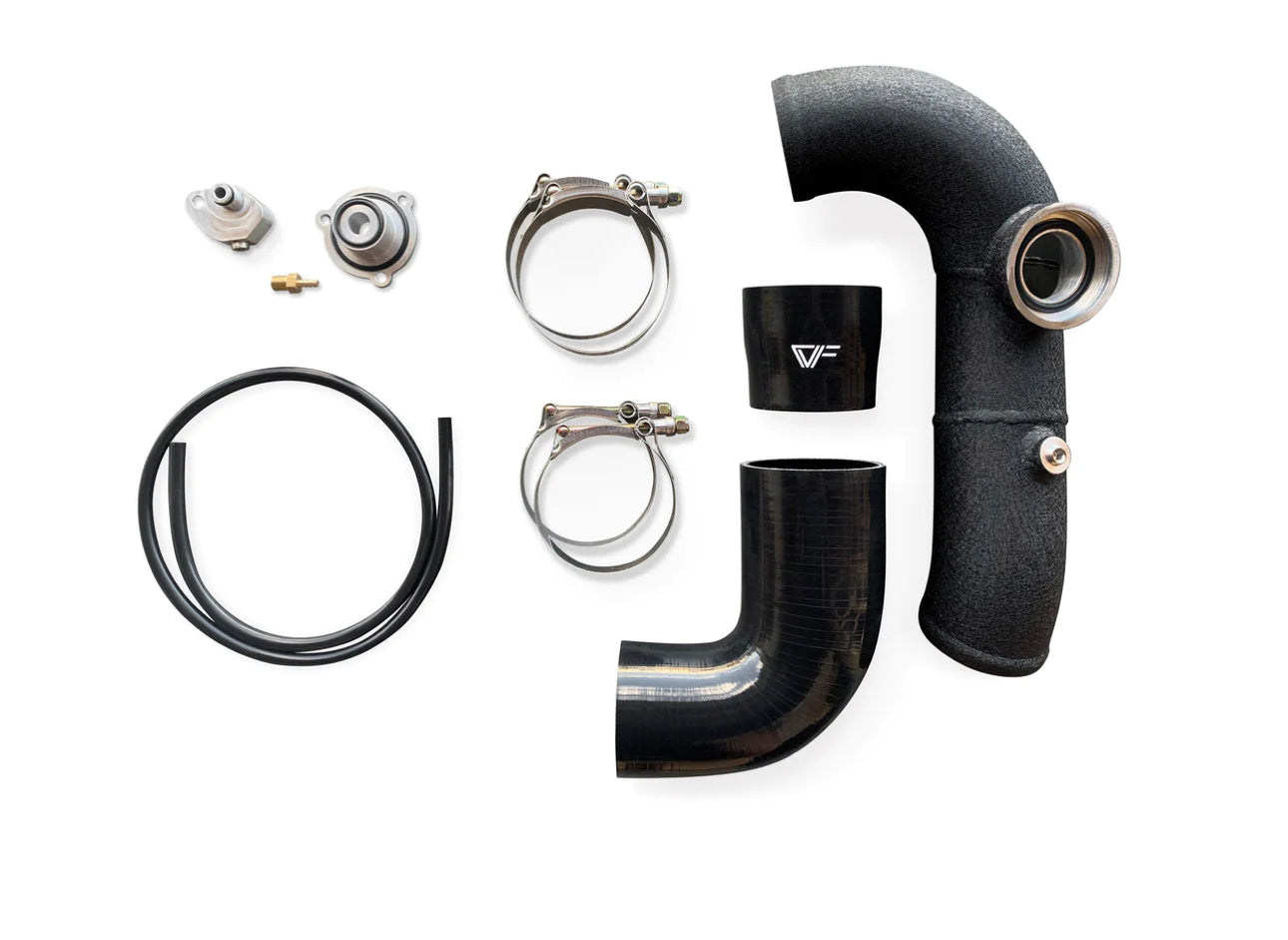 The mandrel bends allow for smooth air flow and the 4-layer silicone couplers with ultra-resistance fibers offer enhanced tolerance against heat and pressure. High-tension t-bolt clamps are also included in the kit. This pipe features a 1/8th NPT bung for meth injection (comes plugged). The kit also features the CVF Boost Reference Adapter Kit and Block-off Plate for seamless installation.